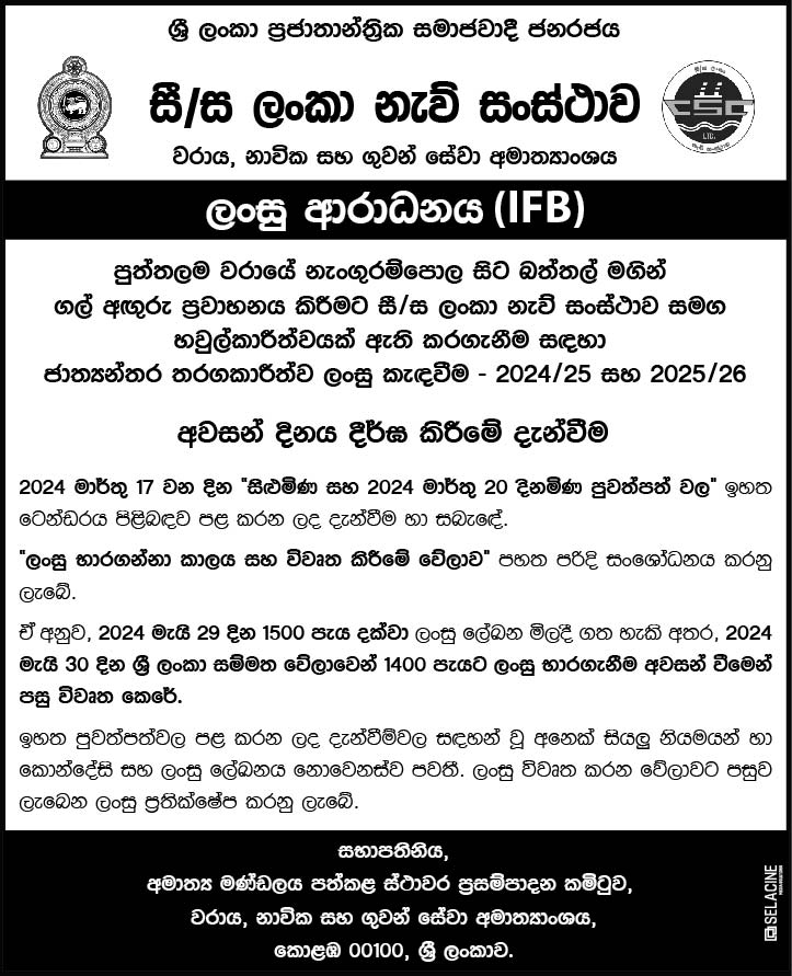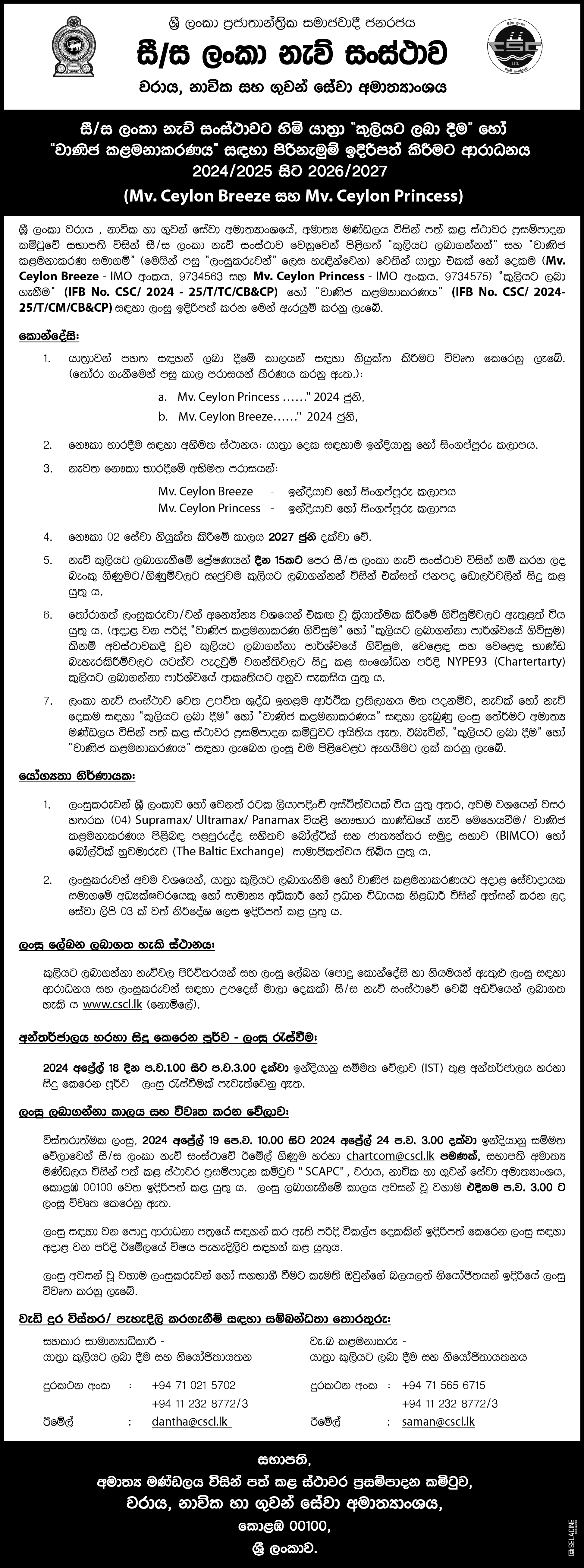 | # | 20/11/2024 | INVITATION TO BIDS FOR HULL & MACHINERY(H&M) AND WAR INSURANCE COVERS FOR THE VESSELS “MV. CEYLON BREEZE” AND “MV. CEYLON PRINCESS” OF CEYLON SHIPPING CORPORATION LIMITED – 2025/2026 |