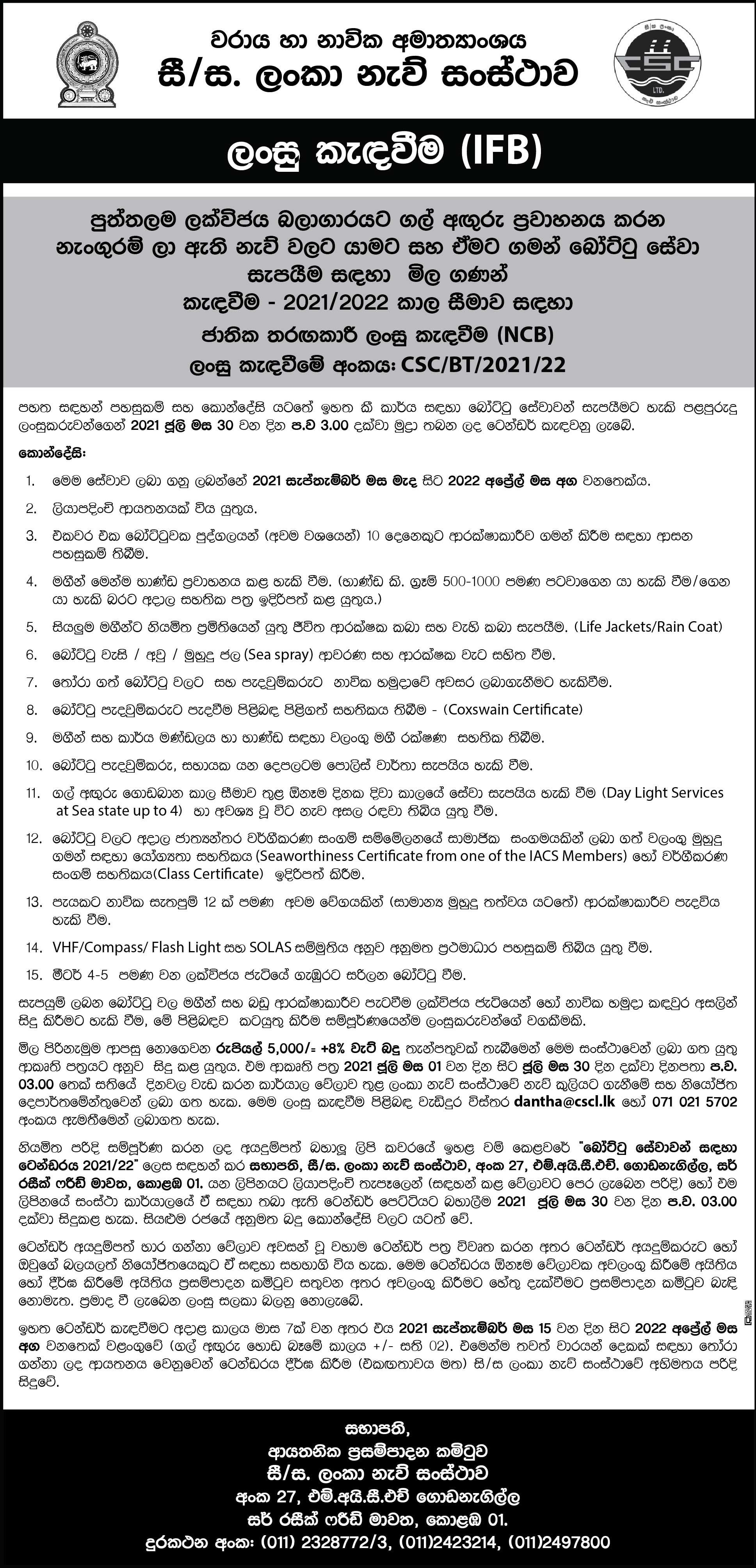 | # | 12/09/2025 | INVITATION TO BIDS FOR HULL & MACHINERY(H&M) AND WAR INSURANCE COVERS FOR THE VESSELS “MV. CEYLON BREEZE” AND “MV. CEYLON PRINCESS” OF CEYLON SHIPPING CORPORATION LIMITED – 2026/2027 |